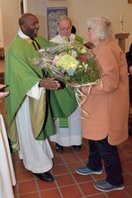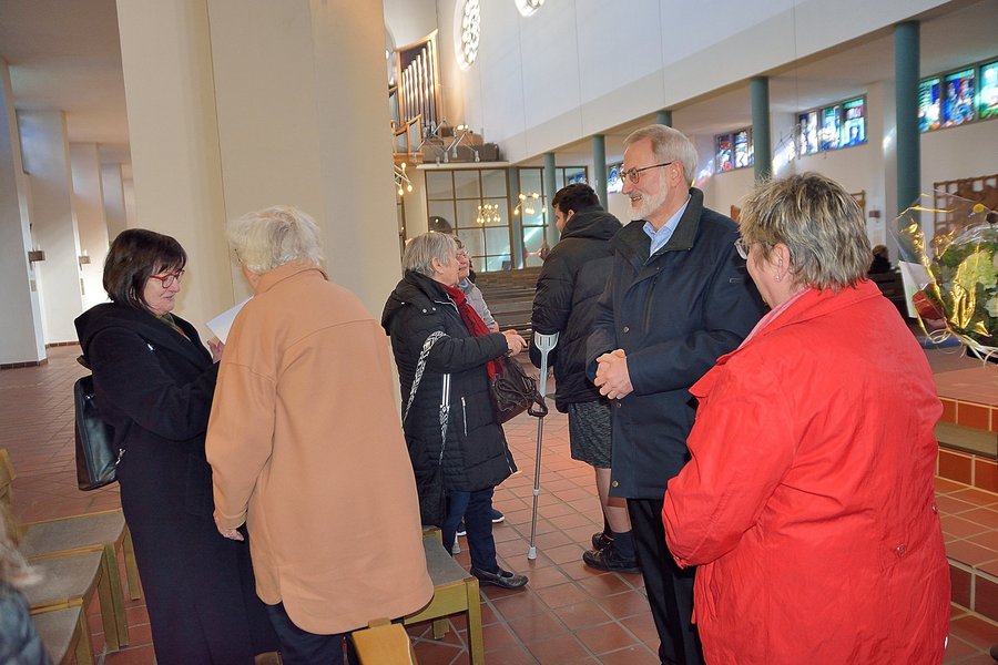 57 Jahre - was ist da nicht alles passiert. Aufgezählt werden im Einzelnen kann das nicht, da können nur Überbegriffe wie "Organisieren", "Kümmern" und "Unermüdlichkeit" genannt werden. Mit der ihr eigenen Menschenkenntnis hatte und hat Anita Ott immer ein offenes Ohr für alle - und sie hat das Herz auf dem rechten Fleck. St. Ludwig ist ihr Heimat und Lebensmittelpunkt zugleich - und wird es auch bleiben. Lang anhaltender Applaus der Gottesdienstbesucher*innen erklang als Diakon Hubert Münchmeyer und Pfr. Thomas ein Blumengebinde überreichten.