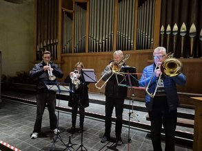 Wegen des Wetters wurde das ursprünglich draußen geplante Turmblasen in den Innenraum der Kirche verlegt. So erschallten von der Orgelempore die Klänge bekannter Lieder, denen etliche noch lange lauschten. Ehrenamtliche hatten außerdem einen kleinen Umtrunk vorbereitet, den viele Gottesdienstbesucher*innen gern nutzten, um im Vorraum von St. Ludwig miteinander und dem Pfarrer ins Gespräch zu kommen.