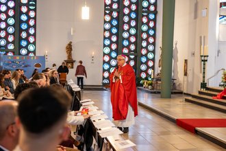 Nach einer gemeinsamen Probe am 2. Oktober war er dann endlich da - der Tag der Firmung. Die Firmbewerber*innen (45 Jugendliche sowie 3 Erwachsene) und ihre Angehörigen sowie die Gottesdienstbesucher*innen warteten gespannt auf den Einzug des liturgischen Dienstes mit Bischof Dr. Karl-Heinz Wiesemann. In der Predigt ging Bischof Dr. Karl-Heinz Wiesemann auf den Begriff der Firmung ein: firm werden ist gleichzusetzen mit fest werden, mit Vertrauen haben. Gottes Geist will lebendig machen und Kraft geben. Er erinnerte daran, dass die Firmung freiwillig ist und freute sich, dass so viele Firmbewerber*innen dieses Sakrament erbitten. Auch erinnerte er an den Mauerfall vor 35 Jahren - es war damals sehr bewegend zu sehen, wie die Menschen die Freiheit gefeiert haben - und zu spüren, was Gottes Geist bewegen kann. Jede/r Firmbewerber*in kommt mit dem eigenen Leben, mit den eigenen Fragen zu Gott - und er ermunterte die Firmbewerber*innen, die Vision Jesu als Alternative für das eigene Leben zu sehen - als eine Sprengkraft, die bewegen kann. Der Gottesdienst wurde musikalisch gestaltet von der Band Herz Jesu unter der Leitung von Jörg Neubauer; an der Orgel spielte Bernd Sommer.