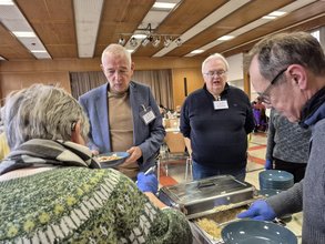 Georg Kuthan ist ein Unternehmer, der nicht die Augen verschließt vor den Notlagen der Menschen in Ludwigshafen und Umgebung. So ist es für den Inhaber des Makler-Unternehmens Kuthan-Immobilien selbstverständlich, sich auch sozial zu engagieren. Als bekannt wurde, dass das Winterhilfe-Mittagessen nur mit Spenden aufrechterhalten werden kann, entschloss er sich zu einem finanziellen Zuschuss in Höhe von 500 Euro. Er hat gemeinsam mit Pflegewirt Thorsten Müller am Montag, 19. Januar 2026, auch die Bedienung an einem Tisch übernommen. Thorsten Müller – einer der Ehrenamtlichen im Team – ist mit Georg Kuthan befreundet und hatte ihn dazu angestiftet. Beide setzten sich zum Essen an „ihren“ Tisch und unterhielten sich angeregt mit den anderen Besuchern.