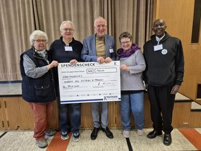 Spendenübergabe - v. l. n. r.: Anita Ott, Thorsten Müller, Georg Kuthan, Gemeindereferentin Simone Hartner und Pfr. Dr. Thomas Kigen Cherono